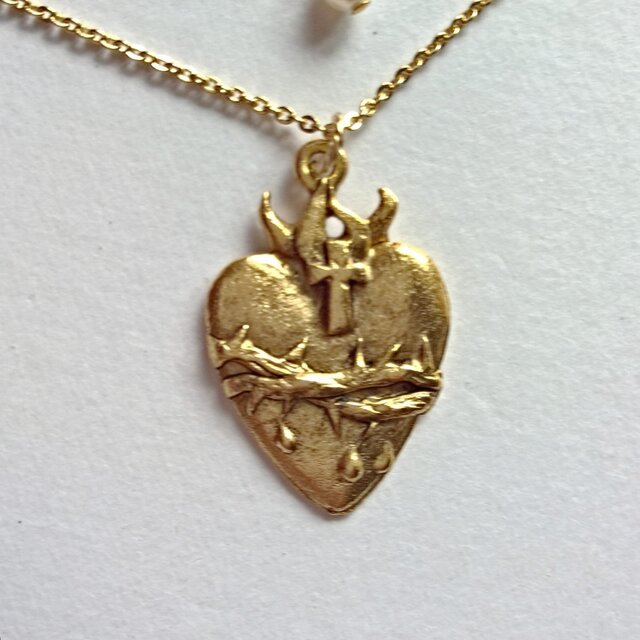 アメリカ製の セイクリッドハート(聖なる心臓) のモチーフを(ピューター製、30mm ×18mm)でネックレスを作りました。