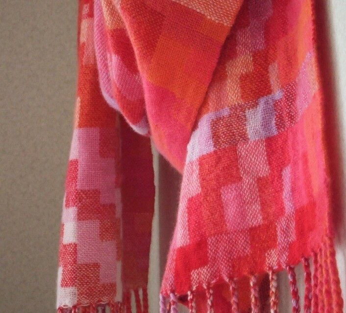 ワイン系、オレンジ系、ローズ系と、とにかく「赤」を集めて織りました。