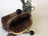 色々な色に染め上げた柿渋布をパッチワークし、がま口ショルダーに仕上げました。
