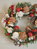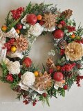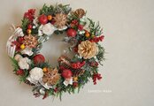 リース資材:アーティフィシャルフラワー(コニファー・リンゴ・赤い実・ローズヒップ・ユーカリ、など)、自然素材(松かさ・ソラフラワー・トウヒハーフ・スターコーンヘッド・山苔、など)、その他(リボンモチーフ、リボン飾り→リース左中央のコットン英字プリントリボンは 付け外しできます)