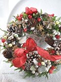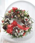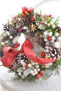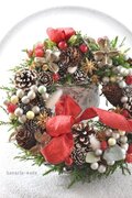 リース素材:アーティフィシャルフラワー(コニファーローズヒップ・ラズベリー、など)、ドライ資材(松かさ・グイ・ワタカラ・山苔・スターアニス・エゾマツ・ラグラス、など)、その他(シルバーのボール、リボン飾り→取り外しはできません)