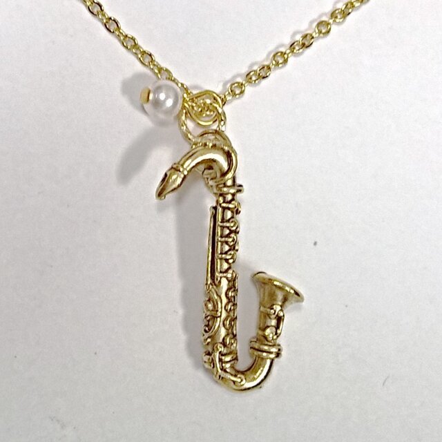 アメリカ製の サックス の ゴールド モチーフ(ピューター製26mm×6mm)に スワロフスキーのホワイトパールをあしらって ネックレスにしました。