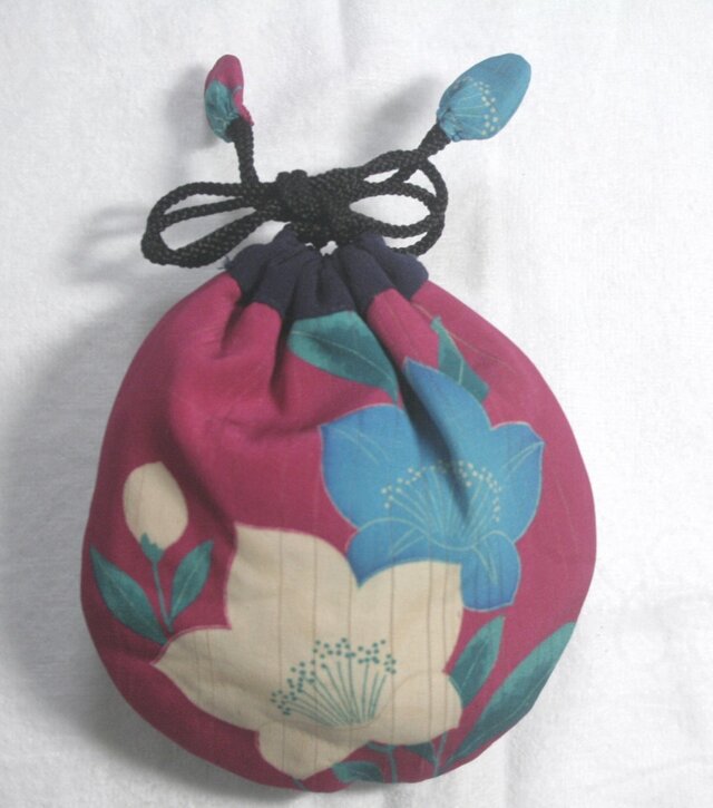 持ち手の紐を、きゅっと絞ると 表はなでしこ、裏は桔梗