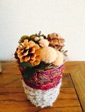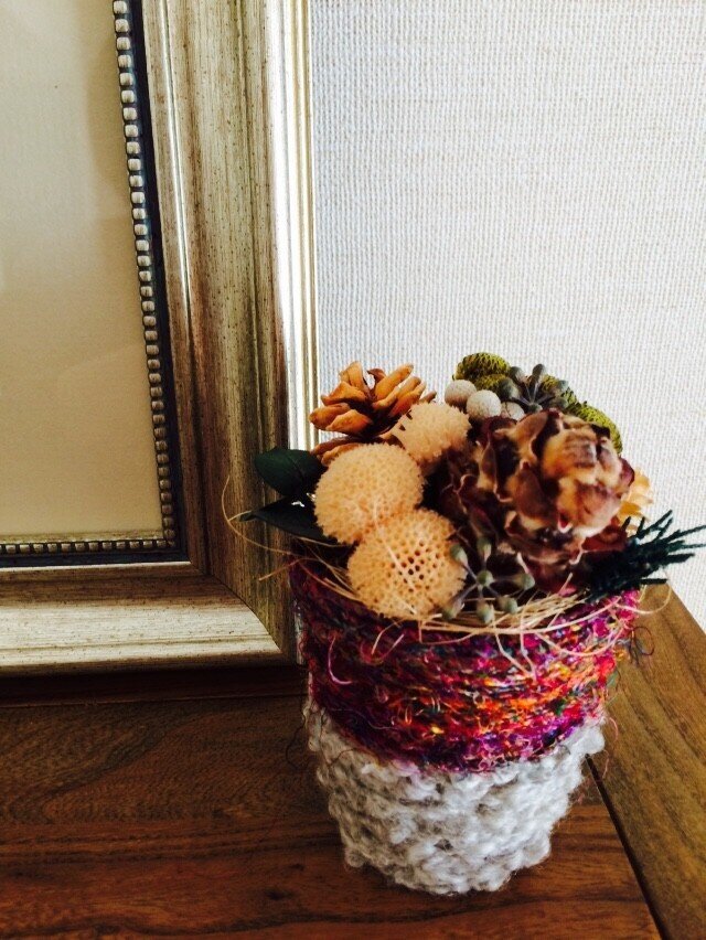2種類の毛糸を花器にくるくる巻きつけて暖かい雰囲気がでるようにしあげました。