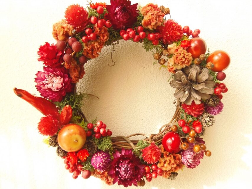 こちらのリースはドライフラワーや実物を中心に使用していますので