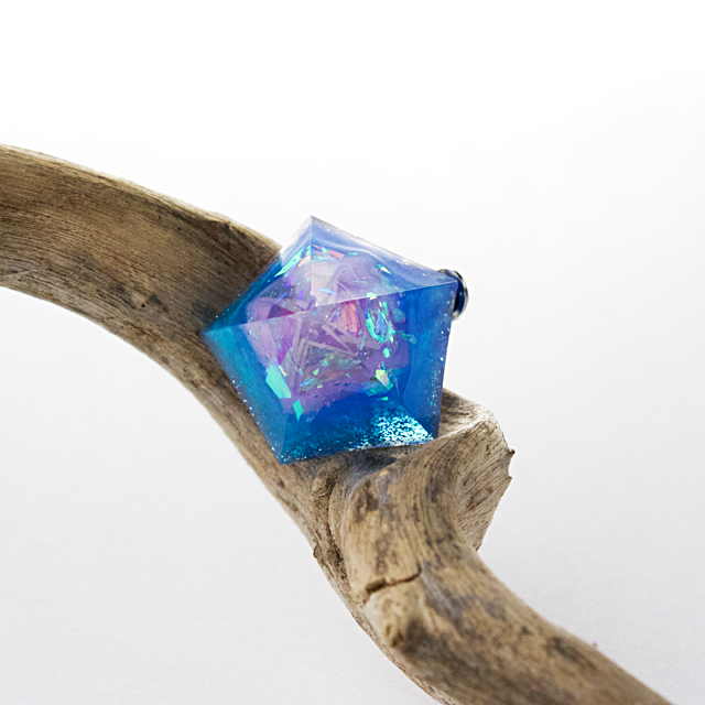 様々なブルーとオーロラをクリスタルレジンで閉じ込めたペンタゴン型のイヤリングです。