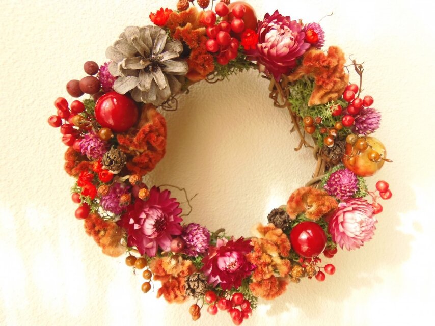 こちらのリースはドライフラワーや実物を中心に使用していますので