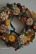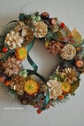 リース素材:アーティフィシャルフラワー(ローズヒップ・ベロニカ・ヘリクリサム・グリーンの実・リーフ・コニファー、など)、ドライ資材(松かさ・ワタカラ・トーヒハーフ・アンバーバーム・トータムローズ、など)、その他(リボン飾り→取り外しできません)