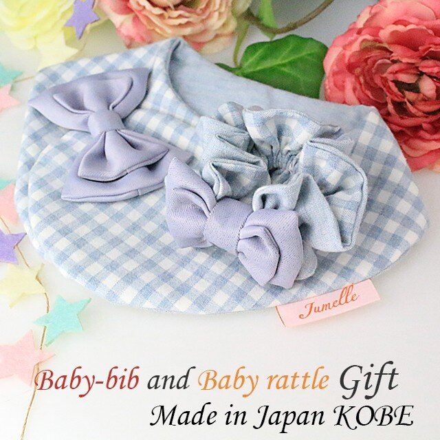 まあるいお出掛けスタイ(よだれかけ)水色ギンガムチェックとシュシュ形ラトルセット