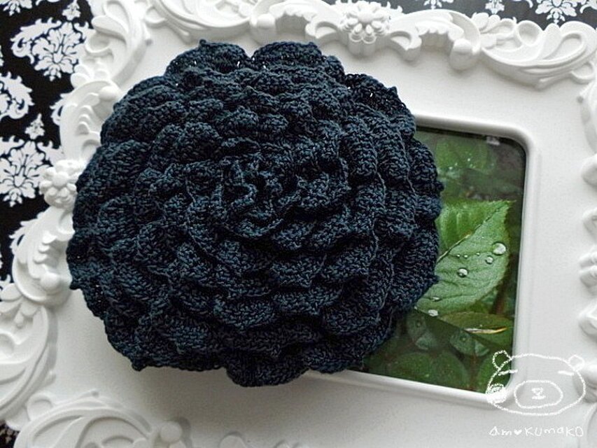 かぎ編みの薔薇モチーフを二枚重ね合わせた、両手に乗るサイズのポーチです。