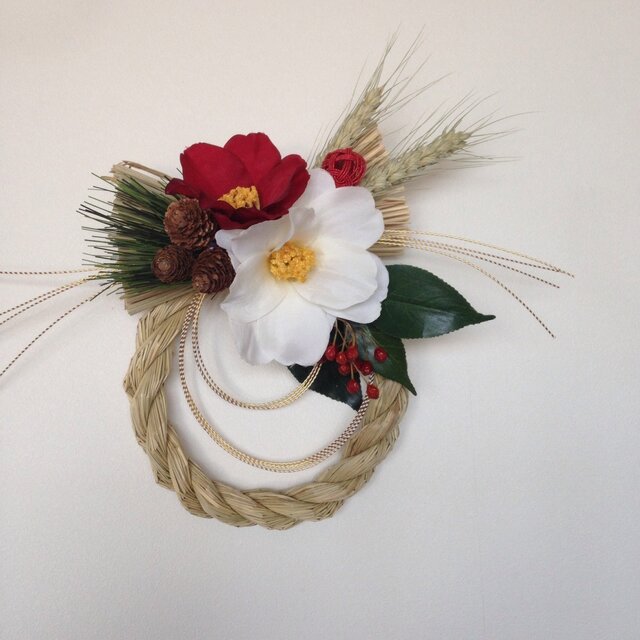 紅白の椿がおめでたいお正月にぴったりなしめ縄リースです。