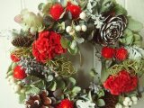秋色紫陽花をベースに真っ赤なケイトウと千日紅が映えるリースです。