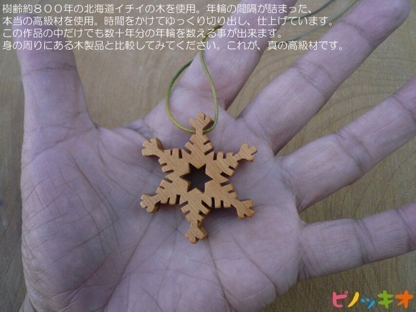 こんにちは。今回は樹齢約800年の北海道産のイチイ(一位)を使用し、雪の華~結晶をモチーフにしたペンダントを作りました。