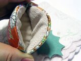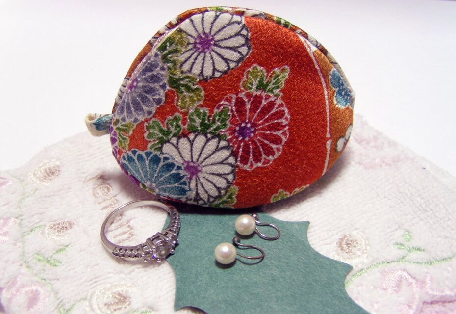 大切なアクセサリーを入れるため、表地に芯を貼り更にキルト芯でふんわり優しくし、中にもキルト芯と優しい手触りの着物地です。