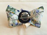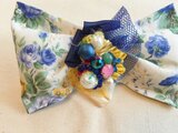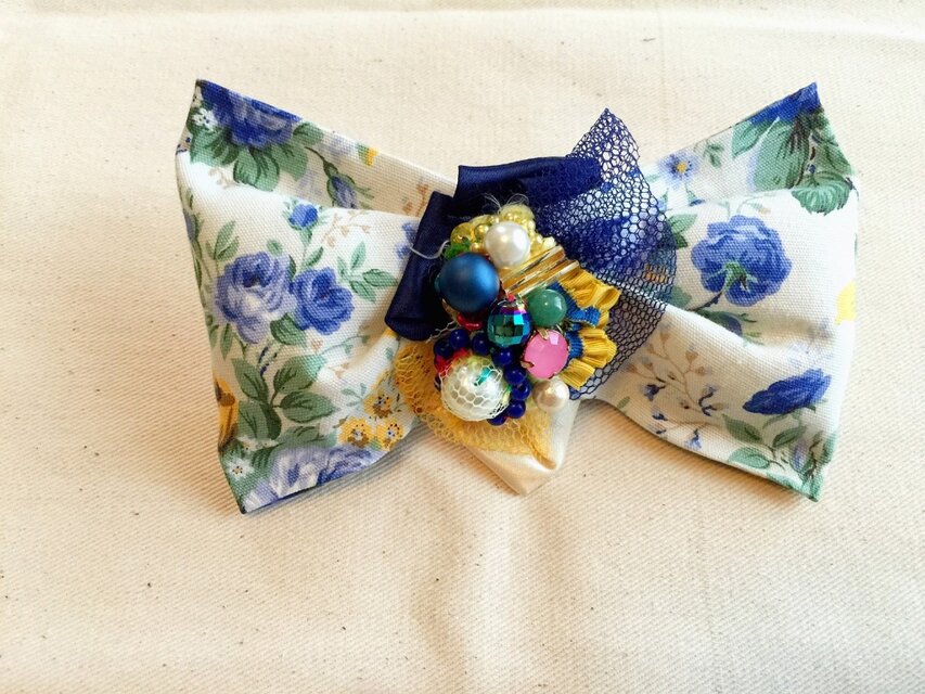 アシメトリーなリボンの形をした花柄のコサージュです。