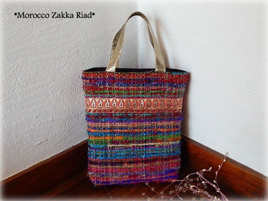 ネパールのシルクサリーを使った裂き織生地で作りました。ビビットな色合いが元気をくれます。