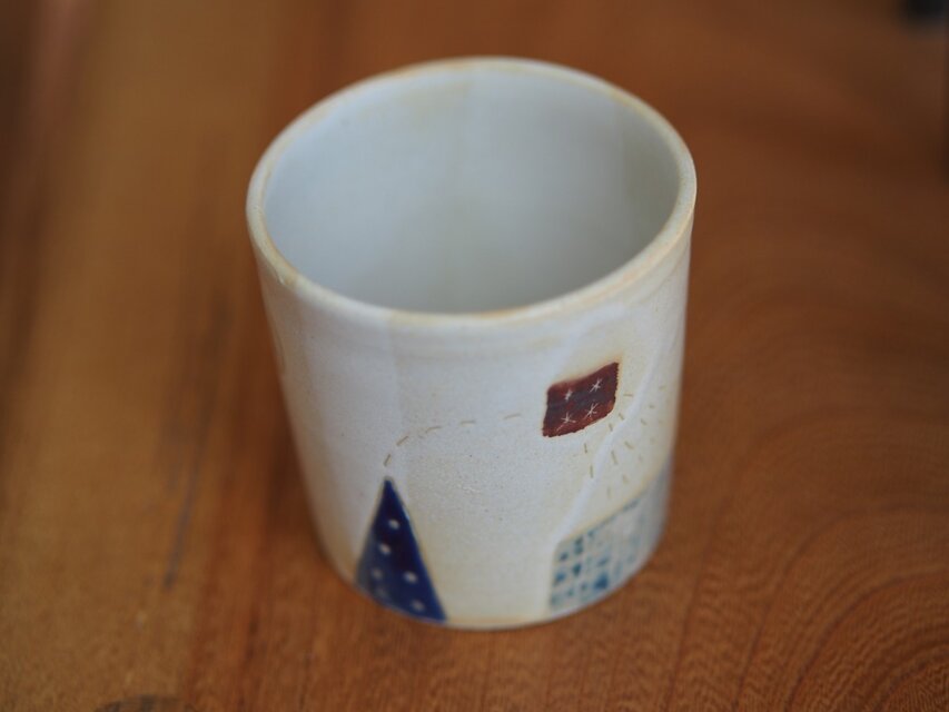 音をイメージして、いろいろな抽象的な形を描きこんだ陶のコップです。