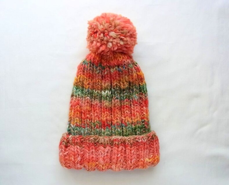 その手紡ぎ糸を使った手編みのニット帽です。