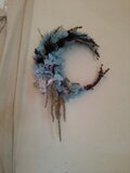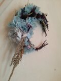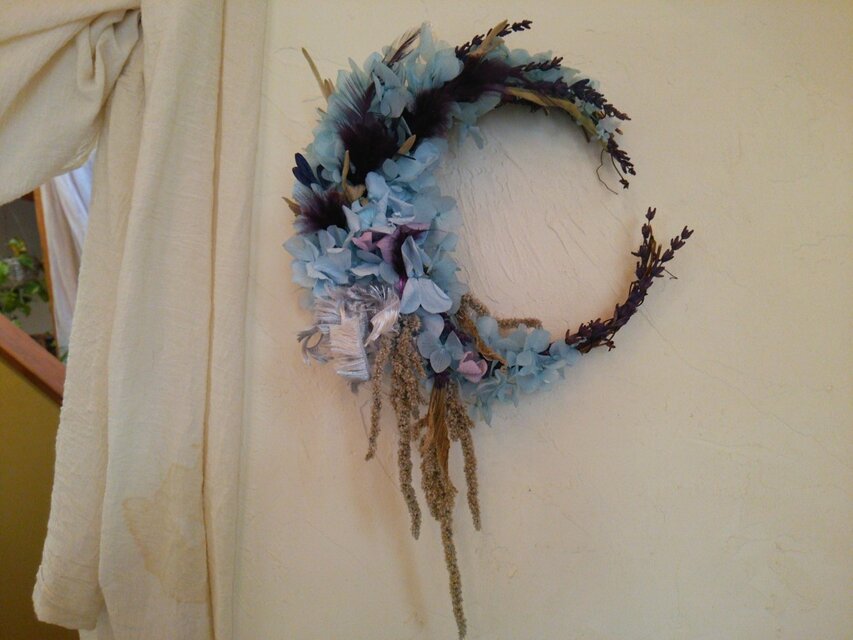 プリザーブドフラワーの水色のアジサイや印象的な、パープルの羽などで作った三日月形のリースです。