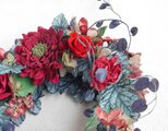 ベルベット調の深い赤色の印象的なジニアを主役にして赤バラを添えてリースにしてみました。シックな大人っぽいリースです。ラメの入った赤い小花がさりげなく華やかさを醸し出しています。