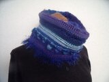 青、紫系の毛糸を組み合わせて編んだネックウォーマーです。