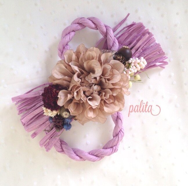 アーティシャルフラワーとドライの木の実で作りました。