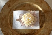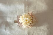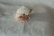 アーティフィシャルフラワーのマムとリボンや毛糸を合わせたコサージュ。