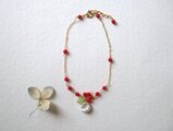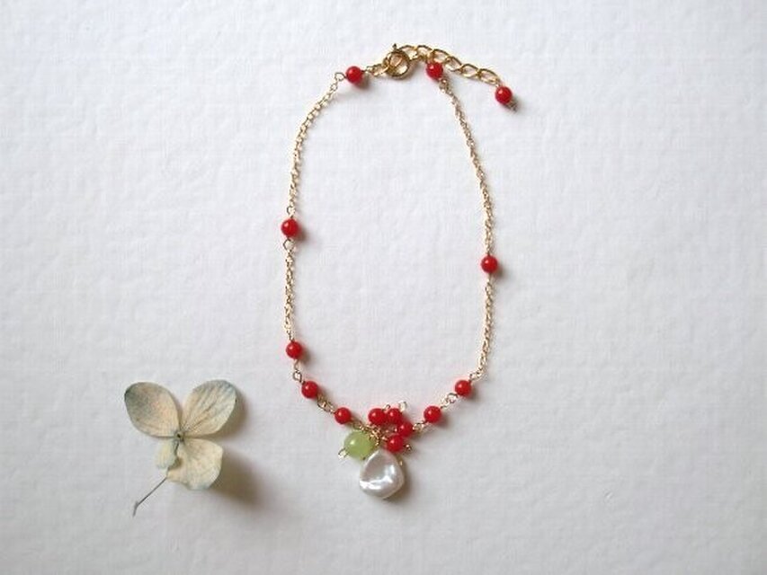 南天の真っ赤な粒々の実をイメージして赤珊瑚と、雪をイメージした芥子パール、そしてアクセントにイエローグリーンジェードを一粒ぶら下げたブレスレットです。お正月や冬を連想させる明るくはっきりした色あい、実のようにかたまった赤珊瑚と芥子パールがポイントです。白や黒のセーター、または着物にも似合うかな、と思います。