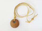 ペンダントトップの直径は約39mm、厚み17mm。全体の重さは10gです。ネックレス部(黄茶平革紐3mm I)一周の最大長さは840mmほど。また、それ以下のサイズでの調整が可能です。