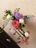 藤色やコーラルピンクなど、女性がより美しく見える色で華やかさを出し、シルバーのアートリーフや小花柄が可愛らしいオーガンジーのリボンでアクセントをつけました(^O^)