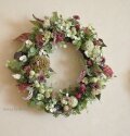 リース土台:ナチュラル素材 直径約20センチ リース素材:アーティフィシャルフラワー(クラスペディア・フォックステイル・アルケミラモリス・グリーンの実・白い実・ホップ、など)、自然素材(グイの実・野グルミ・ピナスカプリシャス・山苔、など)
