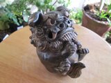 顔の前で手を合わせてお願いポーズのシーサーです。