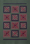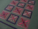 しっかりしたグリーンの綿ツイル生地にレトロな四角モチーフを刺繍した新書サイズのブックカバーです。