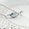 少し歪なしずくのようなカボションに、青く光る瞳のような結晶が印象的だったので、シッポをつけて可愛いお魚モチーフに仕立てました。石を囲むくねくねとした石枠も全て手作業で作っています。