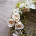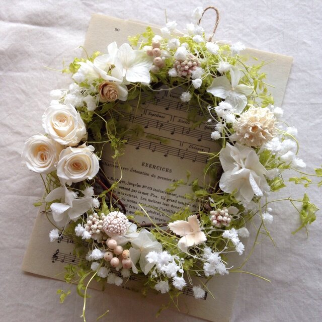 プリザーブドフラワーのサンウィーバインやカスミソウ、バラを使用したリースです。