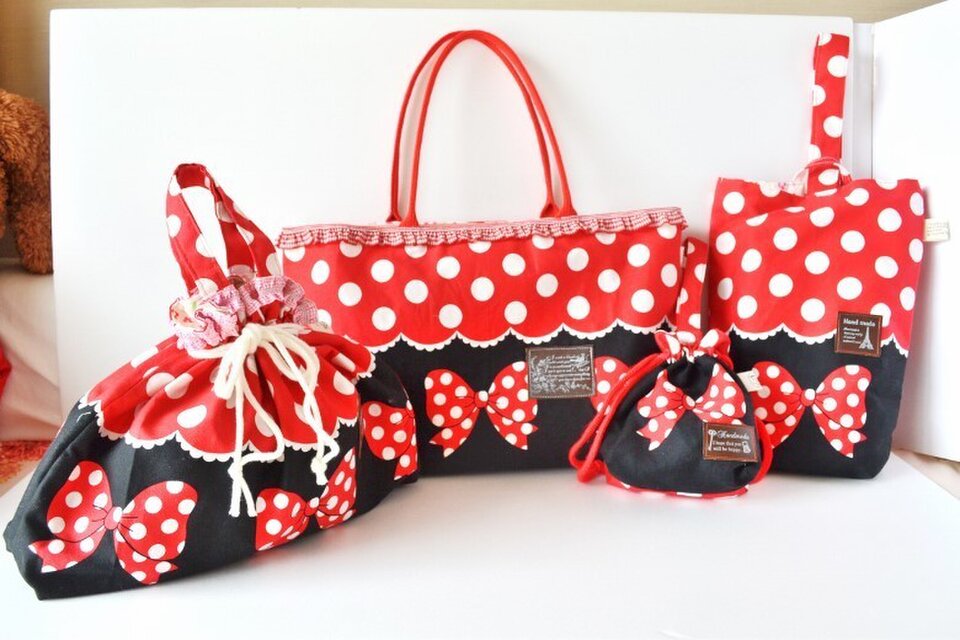 今年の新作レッスンバッグ&シューズ入れ・体育着入れ・コップ入れ巾着の合計4点セットの販売です。