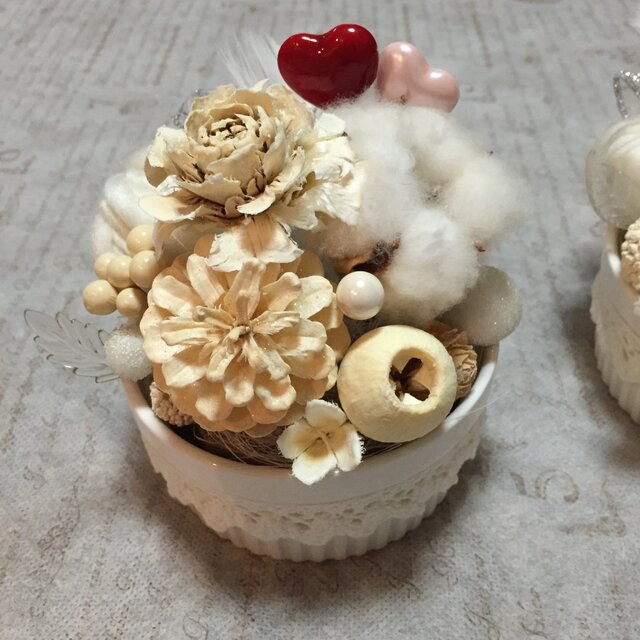 こちらはホワイトのコットンとシダーローズ、木の実等を使い制作いたしました冬のアレンジです。