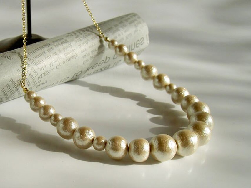 コットンパールとは、綿を圧縮して作られた球体にパール加工が施された模造真珠のことです。