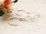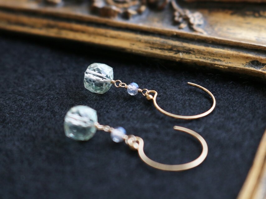 スクエアに美しくカットされたグリーンアメジストに、シラーが神秘的なラブラドライトを一粒繋げました。オフィス使いに、でもちょっと個性的に、をテーマにお石をチョイスしました。柔らかなお色味の中にも、カットに光が反射する様や、ほわっと浮かび上がるブルーのシラーが目を惹く、何処かファンタジックなピアスです。