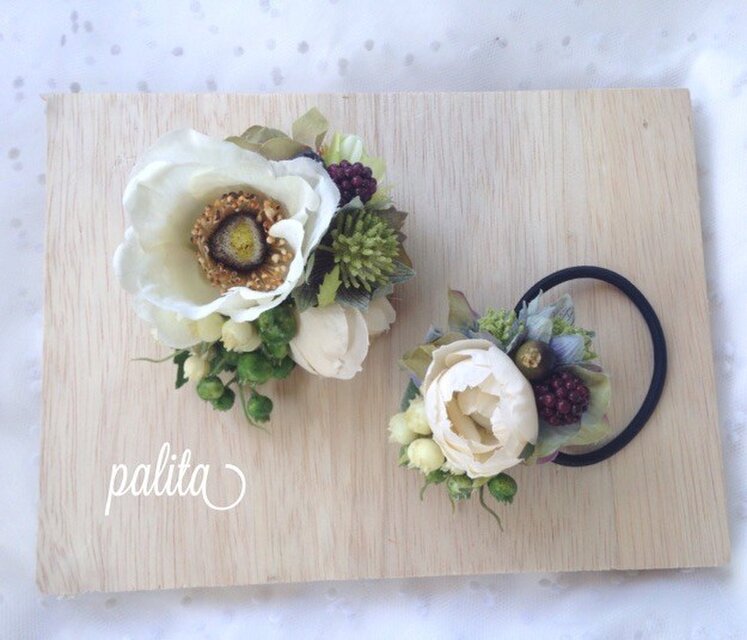 ナチュラルで優しい色合いのコサージュ&ヘアゴムです。