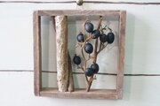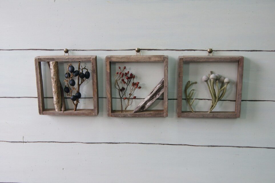 アンティーク調に仕上げた自家製フレームにドライフラワーや小枝をはめこみました。