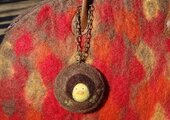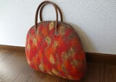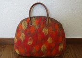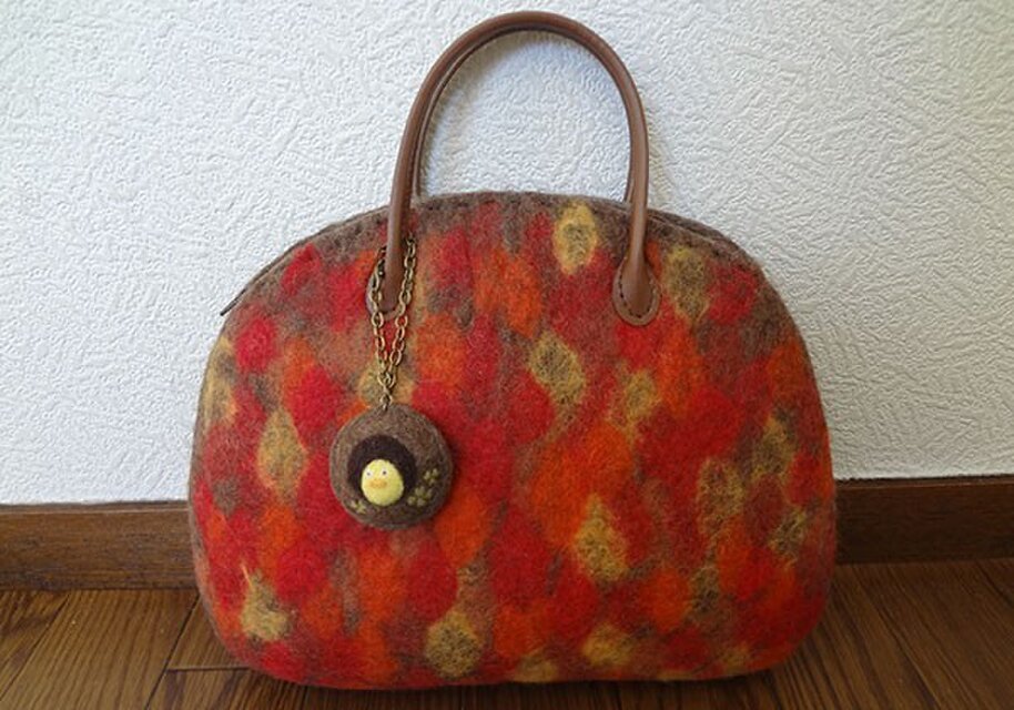 表面は濃い茶をベースに、葉っぱの模様を赤、オレンジ、黄色の羊毛を重ねて入れています。