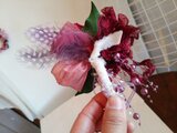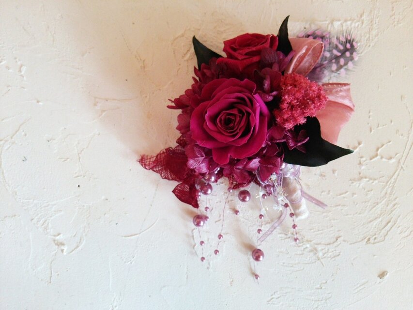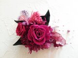 ワインのような濃赤のバラとそれに少しピンクを足したようなカシスレッドのバラを使用してシックな赤いコサージュに仕立てました。