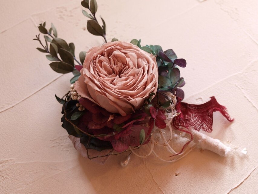 メインには幾重にも重なった花弁がギュッと詰まってコロンとした形が可愛いオールドローズを使用。ヌードベージュ色のローズがとってもしっとりとした大人の雰囲気のコサージュです。