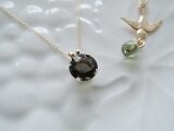 希少石モルダバイト(最高級宝石質グレードAAA以上:8㎜ラウンドブリリアントカット)、モルダバイト(最上級5mm丸玉、AAA++)、14KYGペンダントセッティング、10KYG小豆チェーンネックレス(チェーン幅約0.8㎜:No.2)刻印あり