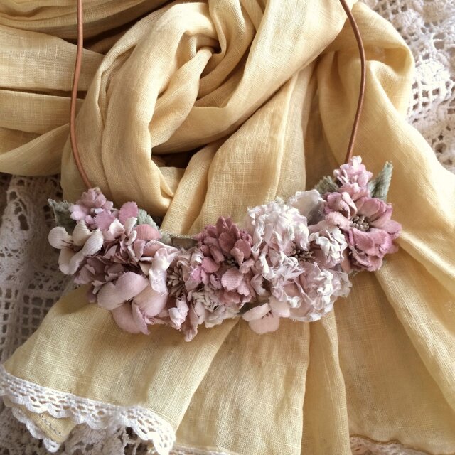 アンティークピンクに染色したお花達でネックレスを作りました。