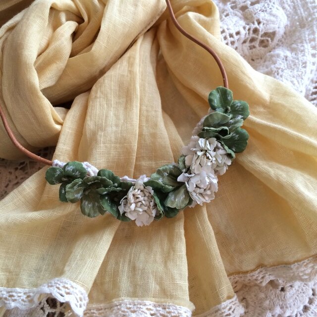 白詰草とクローバーをレースの土台に付けネックレスに仕上げました。