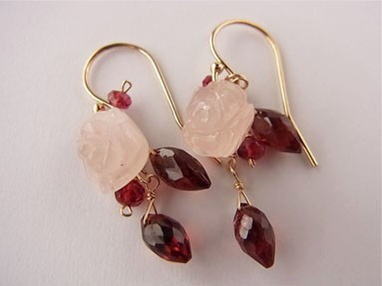 14kgf ローズクォーツとモザンビークガーネットの薔薇ピアス