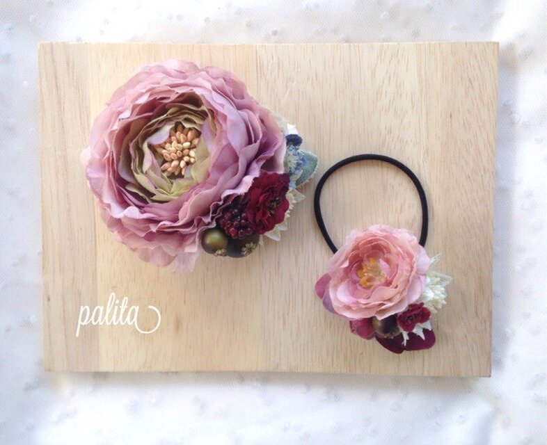 可愛いらしい色合いのコサージュ&ヘアゴムです。
