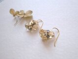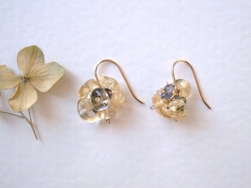 ナチュラルな淡い蜂蜜色のシトリンと濃い青のアイオライトのボタンを、花のようなピアスに仕立てました。